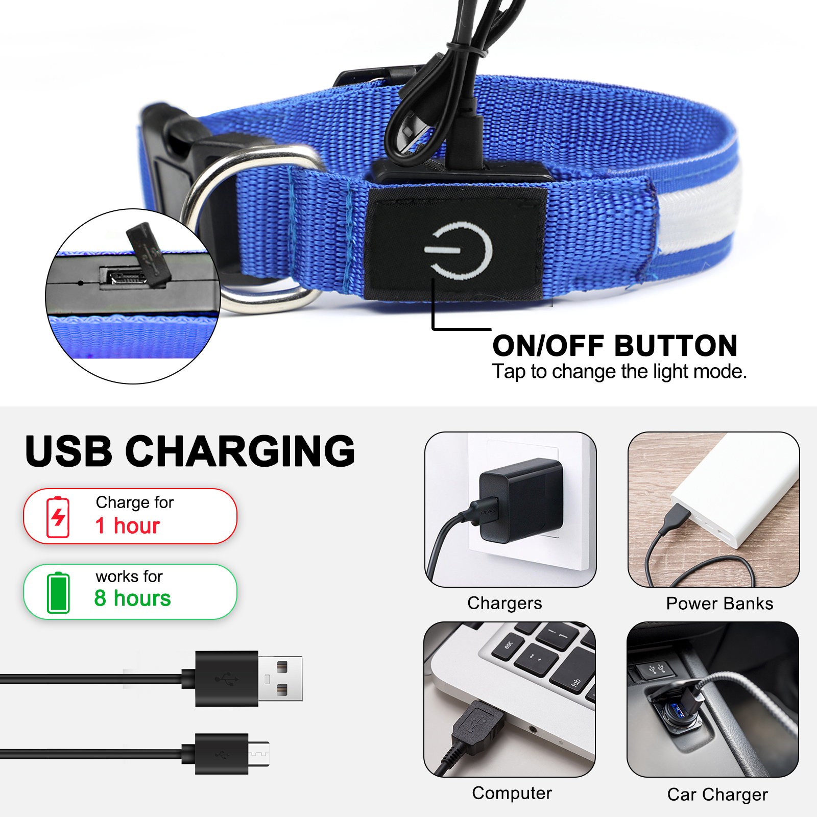- LED DOG COLLAR RECHARGEABLE BY USB : The LED dog collar only needs to be charged for 1 hour to keep the light on for 7-8 hours, keep your dog safe on the go all the time. Using the included charging cable, which can be recharged by charger, mobile power or computer. This light-up dog collar is powered by rechargeable batteries that don’t need to be replaced, saving you time and money.Tips:Please seal the charging port after charging.