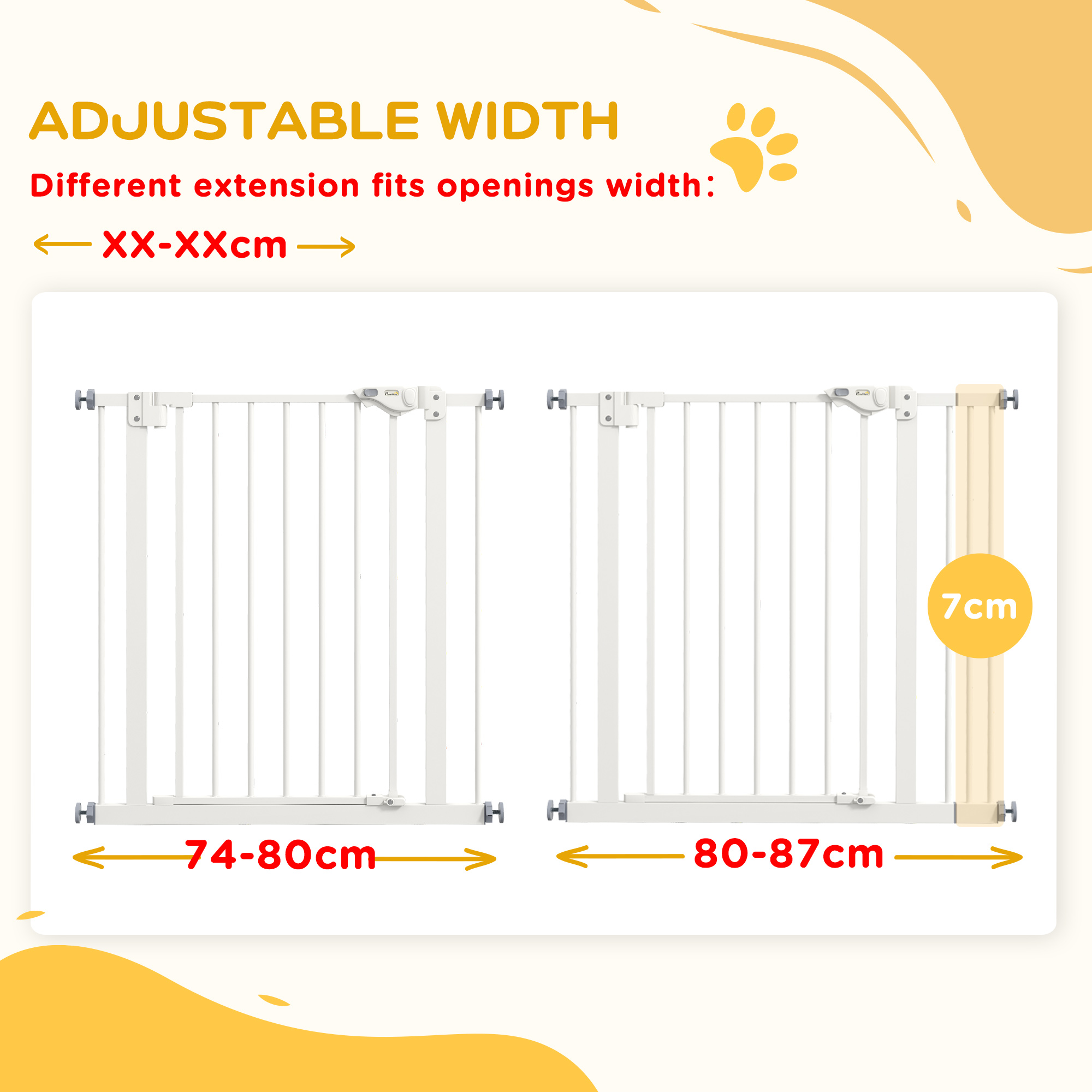Keep pets safely out of restricted areas with this PawHut pet gate. Designed for hallways, doorways and staircases, its adjustable width fits various openings with ease. The strong metal frame is strong and stable, with a pet-safe, lead-free finish. The door closes and locks automatically when left open between 30°–90°, offering extra peace of mind. With accessories included, setup is quick and simple – great for busy homes with curious pets.