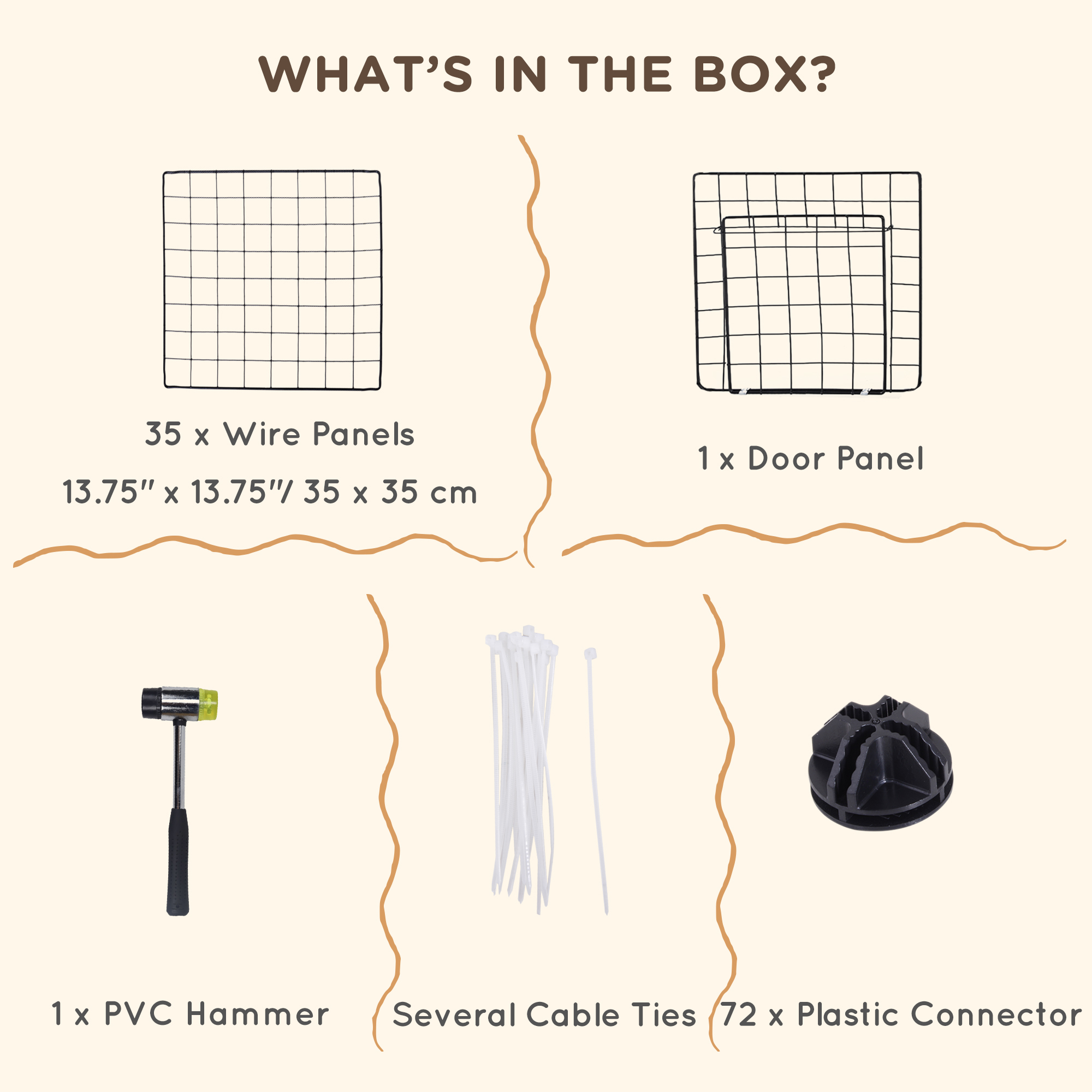 Provide a safe and flexible haven for your beloved small pets with the PawHut pet playpen. Designed with 36 sturdy metal panels, this versatile enclosure allows you to customize the shape and size to fit any space, ensuring your pets have ample room to explore while staying secure. Perfect for indoor or outdoor use, it includes all necessary connectors and cable ties for easy assembly. The open-air design ensures your pets enjoy fresh air and visibility, offering a secure environment.