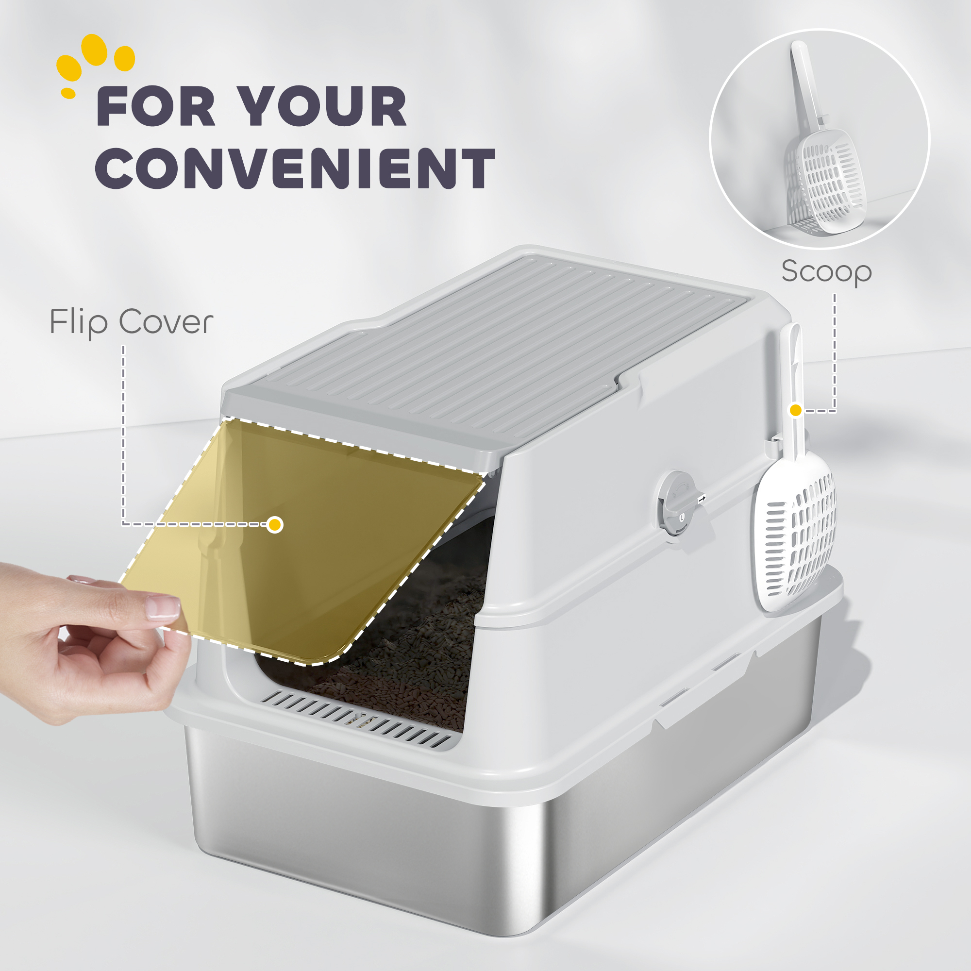 Tired of litter mess and odours? The PawHut cat litter tray features a scratch- and odour-resistant stainless steel design for easy cleaning and hygiene. Spacious enough for larger cats to move freely, its enclosed structure provides privacy and traps smells. The lift-up lid and included scoop make cleaning quick and simple. Compact and stylish, it fits perfectly into any home.